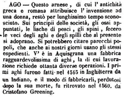 | Ago - Questo arnese, di cui l'antichità greca e romana attribuisce l'invenzione ad una donna, restò per lunghissimo tempo sconosciuto. Sui principii delle società, gli ossi appuntati, le lische di pesci, gli spini, fecero le veci degli aghi e degli spilli che al presente si adoprano. Si potrebbero citare parecchi popoli, che anche ai nostri giorni usano gli stessi espedienti. V'è in Aquisgrana una fabbrica ragguardevolissima di aghi, la di cui lavorazione richiede ottanta diverse operazioni. I primi aghi furono fatti nel 1545 in Inghilterra da un Indiano, e il modo di fabbricarli, perdutosi dopo la sua morte, fu ritrovato nel 1560. da Cristofano Greening. [immagine] |