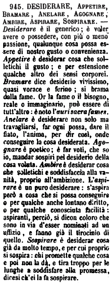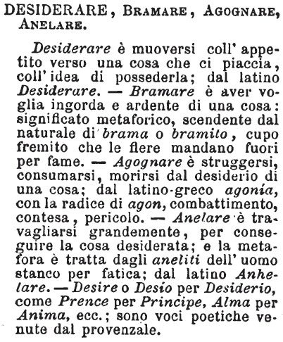 | Desiderare, Bramare, Agognare, Anelare - Desiderare è muoversi coll'appetito verso una cosa che ci piaccia, coll'idea dì possederla; dal latino Desiderare. - Bramare è aver voglia ingorda e ardente di una cosa: significato metaforico, scendente dal naturale di brama o bramito, cupo fremito che le fiere mandano fuori per fame. - Agognare è struggersi, consumarsi, morirsi dal desiderio di una cosa; dal latino-greco agonía, con la radice di agon, combattimento, contesa, pericolo. - Anelare è travagliarsi grandemente, per conseguire la cosa desiderata; e la metafora è tratta dagli aneliti dell'uomo stanco per fatica; dal latino Anhelare. - Desire o Desío per Desiderio, come Prence per Principe, Alma per Anima, ecc.; sono voci poetiche venute dal provenzale. [immagine] |
