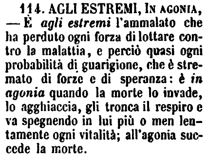 | Agonia - [T.] S. f. Dal gr. ̓Αγωνία, Lotta. L'ultima lotta della vita del corpo con la morte: Ambascia più o meno prolungata che precede alla morte. [Cors.] Bart. Vit. Kost. 2. 7. Ne venni a tal punto che, dato già da' medici per ispacciato, io entrava in agonìa. (Può l'uomo essere agli estremi assai tempo innanzi la morte; e può finire la vita senza agonìa.) T. Essere all'agonìa, dice meno gli estremi aneliti che In agonìa. Assistere all'agonìa d'uno. Suona l'agonìa, quando il segno della campana annunzia un agonizzante. Fino all'agonìa, modo enfatico, Fino agli ultimi istanti.