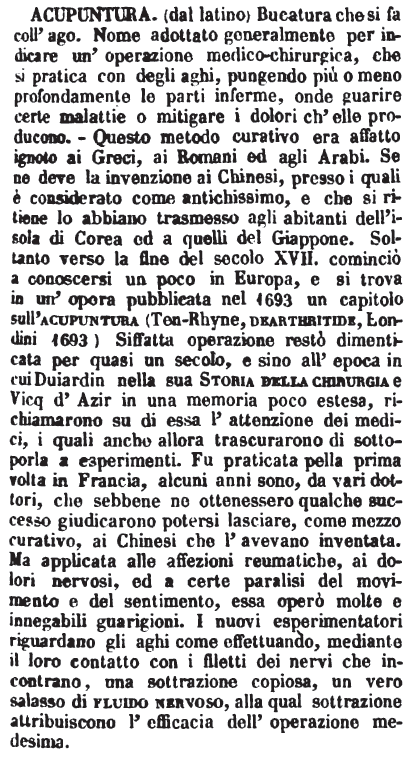| Acupuntura - (dal latino) Bucatura che si fa coll'ago. Nome adottato generalmente per indicare un'operazione medico-chirurgica, che si pratica con degli aghi, pungendo più o meno profondamente le parti inferme, onde guarire certe malattie o mitigare i dolori ch'elle producono. - Questo metodo curativo era affatto ignoto ai Greci, ai Romani ed agli Arabi. Se ne deve la invenzione ai Chinesi, presso i quali è considerato come antichissimo, e che si ritiene lo abbiano trasmesso agli abitanti dell'isola di Corea ed a quelli del Giappone. Soltanto verso la fine del secolo XVII. cominciò a conoscersi un poco in Europa, e si trova in un'opera pubblicata nel 1693 un capitolo sull'acupuntura (Ten-Rhyne, dearthritide, Londini 1693) Siffatta operazione restò dimenticata per quasi un secolo, e sino all'epoca in cui Duiardin nella sua Storia della chirurgia e Vicq d'Azir in una memoria poco estesa, richiamarono su di essa l'attenzione dei medici, i quali anche allora trascurarono di sottoporla a esperimenti. Fu praticata pella prima volta in Francia, alcuni anni sono, da vari dottori, che sebbene ne ottenessero qualche successo giudicarono potersi lasciare, come mezzo curativo, ai Chinesi che l'avevano inventata. Ma applicata alle affezioni reumatiche, ai dolori nervosi, ed a certe paralisi del movimento e del sentimento, essa operò molte e innegabili guarigioni. I nuovi esperimentatori riguardano gli aghi come effettuando, mediante il loro contatto con i filetti dei nervi che incontrano, una sottrazione copiosa, un vero salasso di fluido nervoso, alla qual sottrazione attribuiscono l'efficacia dell'operazione medesima. [immagine] |