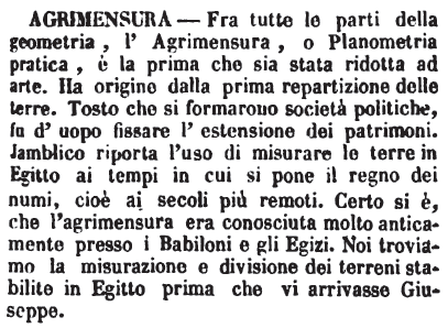 | Agrimensura - Fra tutte le parti della geometria, l'Agrimensura, o Planometria pratica, è la prima che sia stata ridotta ad arte. Ha origine dalla prima repartizione delle terre. Tosto che si formarono società politiche, fu d'uopo fissare l'estensione dei patrimoni. Jamblico riporta l'uso di misurare le terre in Egitto ai tempi in cui si pone il regno dei numi, cioè ai secoli più remoti. Certo si è, che l'agrimensura era conosciuta molto anticamente presso i Babiloni e gli Egizi. Noi troviamo la misurazione e divisione dei terreni stabilite in Egitto prima che vi arrivasse Giuseppe. [immagine] |