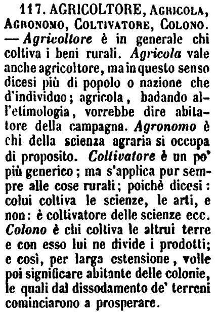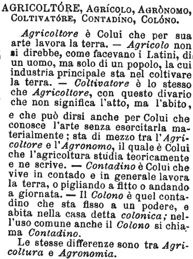 Agricoltore, Agricolo, Agronomo, Coltivatore, Contadino, Colono - Agricoltore è Colui che per sua arte lavora la terra. - Agricolo non si direbbe, come facevano i Latini, di un uomo, ma solo di un popolo, la cui industria principale sta nel coltivare la terra. - Coltivatore è lo stesso che Agricoltore, con questo divario che non significa l'atto, ma l'abito, e che può dirsi anche per Colui che conosce l'arte senza esercitarla materialmente; sta di mezzo tra l'Agricoltore e l'Agronomo, il quale è Colui che l'agricoltura studia teoricamente e ne scrive. - Contadino è Colui che vive in contado e in generale lavora la terra, o pigliando a fitto o andando a giornata. - Il Colono è quel contadino che sta fisso a un podere, e abita nella casa detta colonica; nell'uso comune anche il Colono si chiama Contadino.