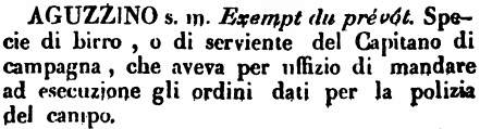 | Aguzzino - s. m. Exempt du prévót. Specie di birro, o di serviente del Capitano di campagna, che aveva per uffizio di mandare ad esecuzione gli ordini dati per la polizia del campo. [immagine] |