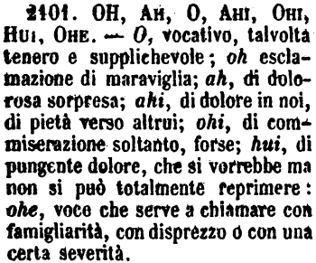 | Oh, Ah, O, Ahi, Ohi, Hui, Ohe - O, vocativo, talvolta tenero e supplichevole; oh esclamazione di maraviglia; ah, di dolorosa sorpresa; ahi, di dolore in noi, di pietà verso altrui; ohi, di commiserazione soltanto, forse; hui, di pungente dolore, che si vorrebbe ma non si può totalmente reprimere; ohe, voce che serve a chiamare con famigliarità, con disprezzo o con una certa severità. [immagine] |