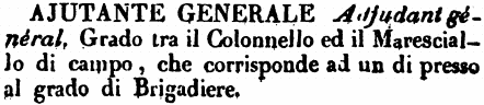| Ajutante generale - Adjudant général. Grado tra il Colonnello ed il Maresciallo di campo, che corrisponde ad un di presso al grado di Brigadiere. [immagine] |