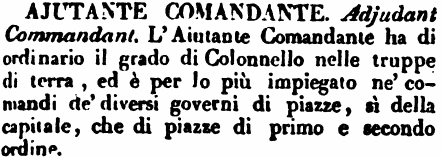 | Ajutante comandante - Adjudant Commandant. L'Aiutante Comandante ha di ordinario il grado di Colonnello nelle truppe di terra, ed è per lo più impiegato ne' comandi de' diversi governi di piazze, sì della capitale, che di piazze di primo e secondo ordine. [immagine] |