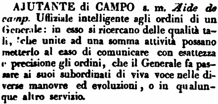 | Ajutante di campo - s. m. Aide de camp. Uffiziale intelligente agli ordini di un Generale: in esso si ricercano delle qualità tali, che unite ad una somma attività possano metterlo al caso di comunicare con esattezza e precisione gli ordini, che il Generale fa passare ai suoi subordinati di viva voce nelle diverse manovre ed evoluzioni, o in qualunque altro servizio. [immagine] |