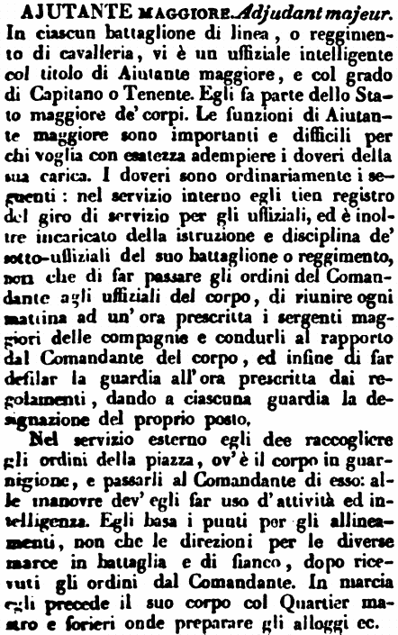 | Ajutante maggiore - Adjutant majeur. In ciascun battaglione di linea, o reggimento di cavalleria, vi è un uffiziale intelligente col titolo di Aiutante maggiore, e col grado di Capitano o Tenente. Egli fa parte dello Stato maggiore de' corpi. Le funzioni di Aiutante maggiore sono importanti e difficili per chi voglia con esatezza adempiere i doveri della sua carica. I doveri sono ordinariamente i seguenti: nel servizio interno egli tien registro del giro di servizio per gli uffiziali, ed è inoltre incaricato della istruzione e disciplina de' sotto-uffiziali del suo battaglione o reggimento, non che di far passare gli ordini del Comandante agli uffiziali del corpo, di riunire ogni mattina ad un'ora prescritta i sergenti maggiori delle compagnie e condurli al rapporto dal Comandante del corpo, ed infine di far defilar la guardia all'ora prescritta dai regolamenti, dando a ciascuna guardia la designazione del proprio posto.