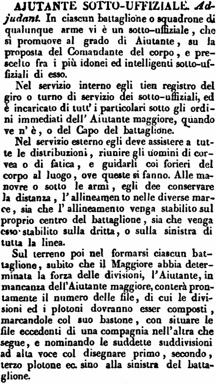 | Ajutante sotto-uffiziale - Adjudant. In ciascun battaglione o squadrone di qualunque arme vi è un sotto-uffiziale, che si promuove al grado di Aiutante, su la proposta del Comandante del corpo, e prescelto fra i più idonei ed intelligenti sotto-uffiziali di esso.