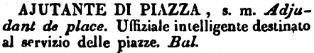 | Ajutante di piazza - s. m. Adjudant de place. Uffiziale intelligente destinato al servizio delle piazze. Bal. [immagine] |