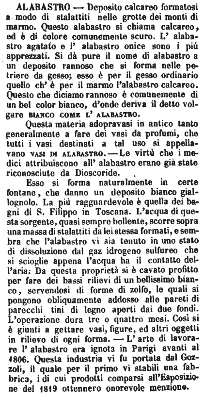 | Alabastro - Deposito calcareo formatosi a modo di stalattiti nelle grotte dei monti di marmo. Questo alabastro si chiama calcareo, ed è di colore comunemente scuro. L'alabastro agatato e l'alabastro onice sono i più apprezzati. Si dà pure il nome di alabastro a un deposito rannoso che si forma nelle petriere da gesso; esso è per il gesso ordinario quello ch'è per il marmo l'alabastro calcareo. Questo che diciamo rannoso è comunemente di un bel color bianco, d'onde deriva il detto volgare bianco come l'alabastro.