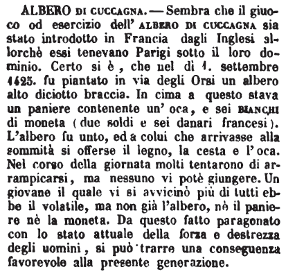 | Albero di cuccagna - Sembra che il giuoco od esercizio dell'albero di cuccagna sia stato introdotto in Francia dagli Inglesi allorchè essi tenevano Parigi sotto il loro dominio. Certo si è, che nel dì 1. settembre 1425. fu piantato in via degli Orsi un albero alto diciotto braccia. In cima a questo stava un paniere contenente un'oca, e sei bianchi di moneta (due soldi e sei danari francesi). L'albero fu unto, ed a colui che arrivasse alla sommità si offerse il legno, la cesta e l'oca. Nel corso della giornata molti tentarono di arrampicarsi, ma nessuno vi potè giungere. Un giovane il quale vi si avvicinò più di tutti ebbe il volatile, ma non già l'albero, nè il paniere nè la moneta. Da questo fatto paragonato con lo stato attuale della forza e destrezza degli uomini, si può trarre una conseguenza favorevole alla presente generazione. [immagine] |