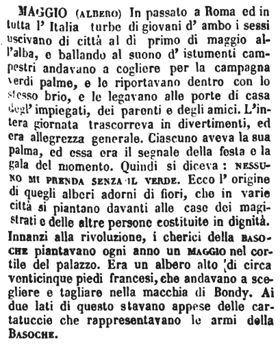 | Maggio (Albero) - In passato a Roma ed in tutta l'Italia turbe di giovani d'ambo i sessi uscivano di città al dì primo di maggio all'alba, e ballando al suono d'istumenti campestri andavano a cogliere per la campagna verdi palme, e le riportavano dentro con lo stesso brio, e le legavano alle porte di casa degl'impiegati, dei parenti e degli amici. L'intera giornata trascorreva in divertimenti, ed era allegrezza generale. Ciascuno aveva la sua palma, ed essa era il segnale della festa e la gala del momento. Quindi si diceva: nessuno mi prenda senza il verde. Ecco l'origine di quegli alberi adorni di fiori, che in varie città si piantano davanti alle case dei magistrati e delle altre persone costituite in dignità. Innanzi alla rivoluzione, i chierici della basoche piantavano ogni anno un maggio nel cortile del palazzo. Era un albero alto di circa venticinque piedi francesi, che andavano a scegliere e tagliare nella macchia di Bondy. Ai due lati di questo stavano appese delle cartatuccie che rappresentavano le armi della Basoche. [immagine] |