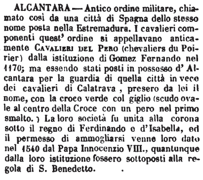 | Alcantara - Antico ordine militare, chiamato così da una città di Spagna dello stesso nome posta nella Estremadura. I cavalieri componenti quest'ordine si appellavano anticamente Cavalieri del Pero (chevaliers du Poirier) dalla istituzione di Gomez Fernando nel 1170; ma essendo stati posti in possesso d'Alcantara per la guardia di quella città in vece dei cavalieri di Calatrava, presero da lei il nome, con la croce verde col giglio (scudo ovale al centro della Croce con un pero nel primo smalto.) La loro società fu unita alla corona sotto il regno di Ferdinando e d'Isabella, ed il permesso di ammogliarsi venne loro dato nel 1540 dal Papa Innocenzio VIII., quantunque dalla loro istituzione fossero sottoposti alla regola di S. Benedetto. [immagine] |