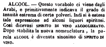 | Alcool - Questo vocabolo ci viene dagli Arabi, e primitivamente indicava il grado di tenuità estrema di certe polveri. Indi si è estesa tale espressione ad alcuni liquori spiritosi. Così dicevasi spirito di vino alcoolizzato. Dopo stabilita la nuova nomenclatura, la parola alcool è divenuta sinonimo di spirito di vino. [immagine] |
