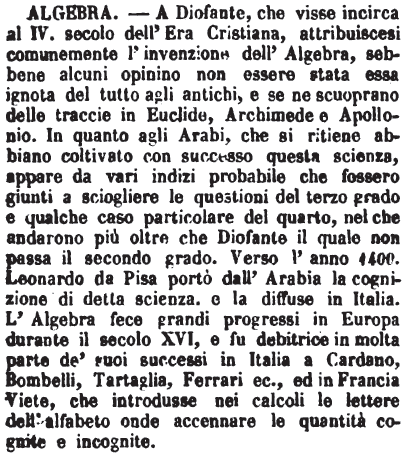 | Algebra - A Diofante, che visse incirca al IV. secolo dell'Era Cristiana, attribuiscesi comunemente l'invenzione dell'Algebra, sebbene alcuni opinino non essere stata essa ignota del tutto agli antichi, e se ne scuoprano delle traccie in Euclide, Archimede e Apollonio. In quanto agli Arabi, che si ritiene abbiano coltivato con successo questa scienza, appare da vari indizi probabile che fossero giunti a sciogliere le questioni del terzo grado e qualche caso particolare del quarto, nel che andarono più oltre che Diofante il quale non passa il secondo grado. Verso l'anno 1400. Leonardo da Pisa portò dall'Arabia la cognizione di detta scienza, e la diffuse in Italia. L'Algebra fece grandi progressi in Europa durante il secolo XVI, e fu debitrice in molta parte de' suoi successi in Italia a Cardano, Bombelli, Tartaglia, Ferrari ec., ed in Francia Viete, che introdusse nei calcoli le lettere dell'alfabeto onde accennare le quantità cognite e incognite. [immagine] |