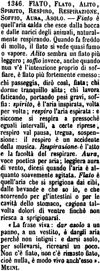 | Fiato, Alito, Respiro - Queste tre voci indicano la stessa cosa, ma con gradazione diversa. Più forte è il Respiro, onde la frase Mi manca il respiro, che è veramente l'atto della respirazione. - Più lieve è il Fiato, che è l'aria che esce dalla bocca naturalmente: «Gli puzza il fiato,» benchè spesso si prenda per lo affaticarsi in atti e in parole. - «Non ho più fiato. - Ho perso - Ho gettato via il fiato.» - Leggerissimo e l'Alito; e alle volte si sente a fatica. [immagine] |