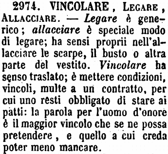 | Vincolare, Legare, Allacciare - Legare è generico; allacciare è speciale modo di legare; ha sensi proprii nell'allacciare le scarpe, il busto o altra parte del vestito. Vincolare ha senso traslato; è mettere condizioni, vincoli, multe a un contratto, per cui uno resti obbligato di stare ai patti: la parola per l'uomo d'onore è il maggior vincolo che se ne possa pretendere, e quello a cui creda poter meno mancare. [immagine] |
