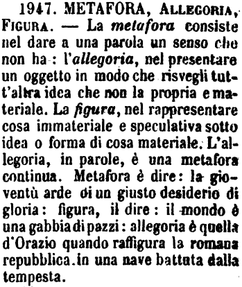 | Metafora, Allegoria, Figura - La metafora consiste nel dare a una parola un senso che non ha: l'allegoria, nel presentare un oggetto in modo che risvegli tutt'altra idea che non la propria e materiale. La figura, nel rappresentare cosa immateriale e speculativa sotto idea o forma di cosa materiale. L'allegoria, in parole, è una metafora continua. Metafora è dire: la gioventù arde di un giusto desiderio di gloria: figura, il dire: il mondo è una gabbia di pazzi: allegoria è quella d'Orazio quando raffigura la romana repubblica in una nave battuta dalla tempesta. [immagine] |