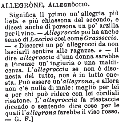 | Allegrone, Allegroccio - Significa il primo un'allegria più lieta e più chiassona del secondo, e dicesi anche di persona un po' arzilla per il vino. - Allegroccio poi ha anche senso di Lascivo così come Grassoccio. - «Discorsi un po' allegrocci da non lasciarli sentire alle ragazze.» - Il dire allegroccia d'una donna sarebbe a Firenze un'ingiuria o una maldicenza. L'allegroccia se non è disonesta del tutto, non è in tutto onesta. Può essere un'allegrona, e allora non c'è nulla di male: meglio per lei e per chi può ridere con lei cordiali risatone. L'allegroccia fa risataccie dicendo o sentendo dire cose per le quali l'allegrona farebbe il viso rosso. - G.F.] [immagine] |