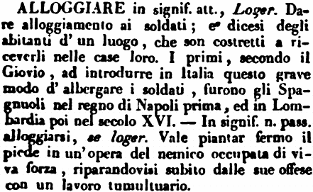 | Alloggiare - in signif. att., Loger. Dare alloggiamento ai soldati; e dicesi degli abitanti d'un luogo, che son costretti a riceverli nelle case loro. I primi, secondo il Giovio, ad introdurre in Italia questo grave modo d'albergare i soldati, furono gli Spagnuoli nel regno di Napoli prima, ed in Lombardia poi nel secolo XVI. - In signif. n. pass. alloggiarsi, se loger. Vale piantar fermo il piede in un'opera del nemico occupata di viva forza, riparandovisi subito dalle sue offese con un lavoro tumultuario. [immagine] |