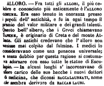 | Alloro - Fra tutti gli allori, il più celebre e conosciuto più anticamente è l'alloro comune. Era esso tenuto in onoranza presso i popoli dell'antichità, e fu in ogni tempo il premio del valor militare e dei grandi talenti. Questo bell'albero, che i Greci chiamavano Dapene, è originario di Creta e del monte Atlante. Gli antichi credevano che l'alloro non venisse mai colpito dal fulmine. I medici lo consideravano come una panacea universale; e senza dubbio per questa ragione si costumava adornare con esso tutte le statue di Esculapio. - In alcuni luoghi s'incoronavano di alloro carico delle sue bacche i nuovi dottori di medicina, che diconsi baccalaureati, nome che sembra derivare da baccae lauri. [immagine] |