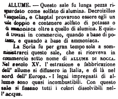 La Sorìa fu per gran tempo sola a somministrarci questo sale, che si riceveva in commercio sotto nome di allume di rocca. Nel secolo XV. l'estrazione e fabbricazione dell'allume si diffusero in Italia, e di là nel nord dell'Europa. - I legni impregnati di allume sono quasi incombustibili. Con questo sale si fissano tutti i colori dissolvibili nell'acqua. [immagine] |