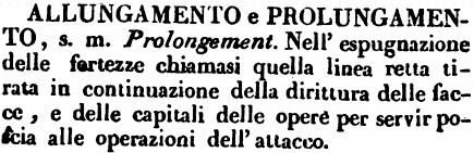 | Allungamento e Prolungamento - s. m. Prolongement. Nell'espugnazione delle fortezze chiamasi quella linea retta tirata in continuazione della dirittura delle facce, e delle capitali delle opere per servir poscia alle operazioni dell'attacco. [immagine] |
