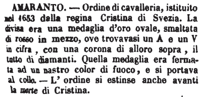 | Amaranto - Ordine di cavalleria, istituito nel 1653 dalla regina Cristina di Svezia. La divisa era una medaglia d'oro ovale, smaltata di rosso in mezzo, ove trovavasi un A e un V in cifra, con una corona di alloro sopra, il tutto di diamanti. Quella medaglia era fermata ad un nastro color di fuoco, e si portava al collo. - L'ordine si estinse anche avanti la morte di Cristina. [immagine] |