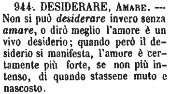 | Desiderare, Amare - Non si può desiderare invero senza amare, o dirò meglio l'amore è un vivo desiderio; quando però il desiderio si manifesta, l'amore è certamente più forte, se non più intenso, di quando stassene muto e nascosto. [immagine] |