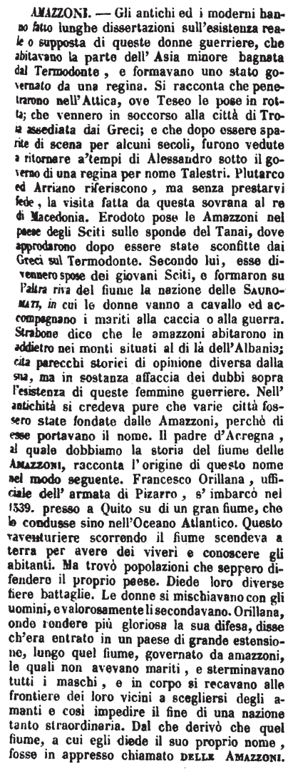 | Amazzoni - Gli antichi ed i moderni hanno fatto lunghe dissertazioni sull'esistenza reale o supposta di queste donne guerriere, che abitavano la parte dell'Asia minore bagnata dal Termodonte, e formavano uno stato governato da una regina. Si racconta che penetrarono nell'Attica, ove Teseo le pose in rotta; che vennero in soccorso alla città di Troia assediata dai Greci; e che dopo essere sparite di scena per alcuni secoli, furono vedute a ritornare a' tempi di Alessandro sotto il governo di una regina per nome Talestri. Plutarco ed Arriano riferiscono, ma senza prestarvi fede, la visita fatta da questa sovrana al re di Macedonia. Erodoto pose le Amazzoni nel paese degli Sciti sulle sponde del Tanai, dove approdarono dopo essere state sconfitte dai Greci sul Termodonte. Secondo lui, esse divennero spose dei giovani Sciti, e formaron su l'altra riva del fiume la nazione delle Sauromati, in cui le donne vanno a cavallo ed accompagnano i mariti alla caccia o alla guerra. Strabone dice che le amazzoni abitarono in addietro nei monti situati al di là dell'Albania; cita parecchi storici di opinione diversa dalla sua, ma in sostanza affaccia dei dubbi sopra l'esistenza di queste femmine guerriere. Nell'antichità si credeva pure che varie città fossero state fondate dalle Amazzoni, perchè di esse portavano il nome. Il padre d'Acregna, al quale dobbiamo la storia del fiume delle Amazzoni, racconta l'origine di questo nome nel modo seguente. Francesco Orillana, ufficiale dell'armata di Pizarro, s'imbarcò nel 1539. presso a Quito su di un gran fiume, che lo condusse sino nell'Oceano Atlantico. Questo avventuriere scorrendo il fiume scendeva a terra per avere dei viveri e conoscere gli abitanti. Ma trovò popolazioni che seppero difendere il loro paese. Diede loro diverse fiere battaglie. Le donne si mischiavano con gli uomini, e valorosamente li secondavano. Orillana, onde rendere più gloriosa la sua difesa, disse ch'era entrato in un paese di grande estensione, lungo quel fiume, governato da amazzoni, le quali non avevano mariti, e sterminavano tutti i maschi, e in corpo si recavano alle frontiere dei loro vicini a scegliersi degli amanti e così impedire il fine di una nazione tanto straordinaria. Dal che derivò che quel fiume, a cui egli diede il suo proprio nome, fosse in appresso chiamato delle Amazzoni. [immagine] |