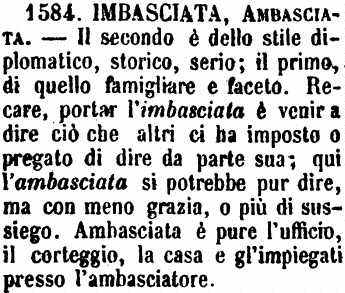 | Imbasciata, Ambasciata - Il secondo è dello stile diplomatico, storico, serio; il primo, di quello famigliare e faceto. Recare, portar l'imbasciata è venir a dire ciò che altri ci ha imposto o pregato di dire da parte sua; qui l'ambasciata si potrebbe pur dire, ma con meno grazia, o più di sussiego. Ambasciata è pure l'ufficio, il corteggio, la casa e gl'impiegati presso l'ambasciatore. [immagine] |