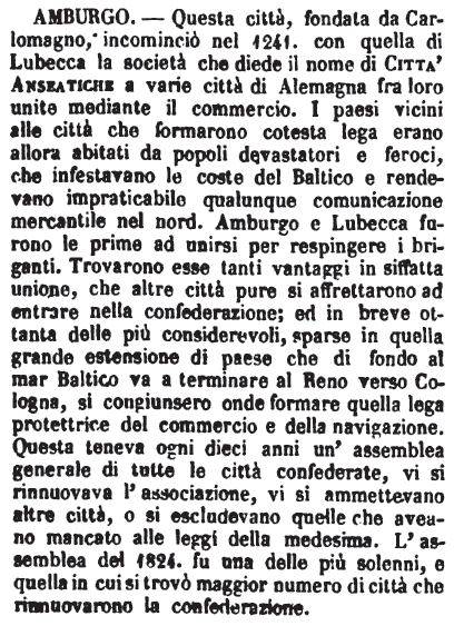 | Amburgo - Questa città, fondata da Carlomagno, incominciò nel 1241. con quella di Lubecca la società che diede il nome di Città Anseatiche a varie città di Alemagna fra loro unite mediante il commercio. I paesi vicini alle città che formarono cotesta lega erano allora abitati da popoli devastatori e feroci, che infestavano le coste del Baltico e rendevano impraticabile qualunque comunicazione mercantile nel nord. Amburgo e Lubecca furono le prime ad unirsi per respingere i briganti. Trovarono esse tanti vantaggi in siffatta unione, che altre città pure si affrettarono ad entrare nella confederazione; ed in breve ottanta delle più considerevoli, sparse in quella grande estensione di paese che di fondo al mar Baltico va a terminare al Reno verso Cologna, si congiunsero onde formare quella lega protettrice del commercio e della navigazione. Questa teneva ogni dieci anni un'assemblea generale di tutte le città confederate, vi si rinnuovava l'associazione, vi si ammettevano altre città, o si escludevano quelle che aveano mancato alle leggi della medesima. L'assemblea del 1824. fu una delle più solenni, e quella in cui si trovò maggior numero di città che rinnuovarono la confederazione. [immagine] |