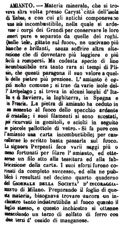 Amianto - Materia minerale, che si trovava altra volta presso Caryst città dell'isola di Eubea, e con cui gli antichi componevano una tela incombustibile, nella quale si ardevano i corpi dei Grandi per conservare le loro ceneri pure e separate da quelle dei roghi. Quelle tele, gittate sul fuoco, ne uscivano più bianche e brillanti, senza soffrire altra alterazione che di doventare più leggiere e più facili a rompersi. Ma codesta specie di lino incombustibile era tanto rara ai tempi di Plinio, che questi paragona il suo valore a quello delle pietre più preziose. L'amianto è oggidi molto comune; si trae da varie isole dell'Arcipelago; si trova in alcuni luoghi d'Italia e di Baviera, in Inghilterra, in Spagna e in Francia. La pietra di amianto ha ceduto in un momento al fuoco dello specchio ardente di cristallo; i suoi filamenti si sono scostati, poi ricurvati in gomitoli, e sciolti in seguito in piccole pallottole di vetro. - Si fa pure con l'amianto una carta incombustibile; per cancellarne lo scritto basta passarla sul fuoco. La signora Perpenti fece varii saggi più o meno fortunati per filare l'amianto, ed ottenerne un filo atto alla tessitura ed alla fabbricazione della carta. I suoi sforzi furono coronati da completo successo, ed ella ne pubblicò i resultati nel decimo quarto quaderno del Giornale della Società d'incoraggiamento di Milano. Preparando il foglio di questa materia, bisognava trovare ancora un inchiostro tanto indistruttibile al fuoco quanto il foglio stesso, e questo inchiostro si ottenne mescolando un terzo di solfato di ferro con due terzi d'ossido di manganese. [immagine]