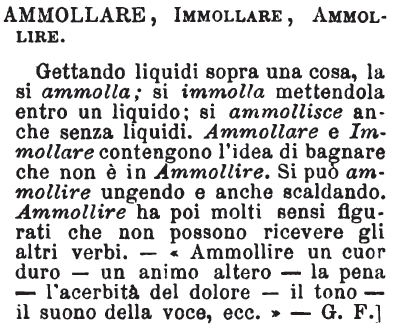 | Ammollare, Immollare, Ammollire - Gettando liquidi sopra una cosa, la si ammolla; si immolla mettendola entro un liquido; si ammollisce anche senza liquidi. Ammollare e Immollare contengono l'idea di bagnare che non è in Ammollire. Si può ammollire ungendo e anche scaldando. Ammollire ha poi molti sensi figurati che non possono ricevere gli altri verbi. - «Ammollire un cuor duro - un animo altero - la pena - l'acerbità del dolore - il tono - il suono della voce, ecc.» - G. F.] [immagine] |