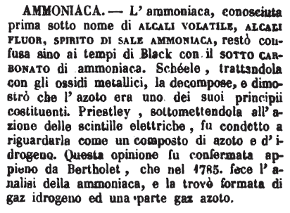 | Ammoniaca - L'ammoniaca, conosciuta prima sotto nome di alcali volatile, alcali fluor, spirito di sale ammoniaca, restò confusa sino ai tempi di Black con il sotto carbonato di ammoniaca. Schéele, trattandola con gli ossidi metallici, la decompose, e dimostrò che l'azoto era uno dei suoi principii costituenti. Priestley, sottomettendola all'azione delle scintille elettriche, fu condotto a riguardarla come un composto di azoto e d'idrogeno. Questa opinione fu confermata appieno da Bertholet, che nel 1785. fece l'analisi della ammoniaca, e la trovò formata di gaz idrogeno ed una parte gaz azoto. [immagine] |