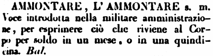 | Ammontare, L'ammontare - s. m. Voce introdotta nella militare amministrazione, per esprimere ciò che riviene al Corpo per soldo in un mese, o in una quindicina. Bal. [immagine] |