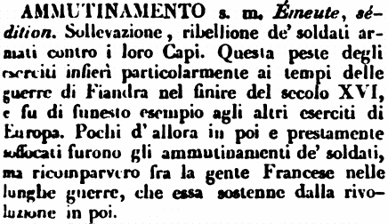 | Ammutinamento - s. m. Émeute, sédition. Sollevazione, ribellione de' soldati armati contro i loro Capi. Questa peste degli eserciti infierì particolarmente ai tempi delle guerre di Fiandra nel finire del secolo XVI, e fu di funesto esempio agli altri eserciti di Europa. Pochi d'allora in poi e prestamente soffocati furono gli ammutinamenti de' soldati, ma ricomparvero fra la gente Francese nelle lunghe guerre, che essa sostenne dalla rivoluzione in poi. [immagine] |