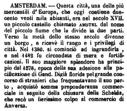 | Amsterdam - Questa città, una delle più mercantili d'Europa, che oggi contiene duecento venti mila abitanti, era nel secolo XVII. un piccolo castello chiamato amstel dal nome del piccolo fiume che la divide in due parti. Verso la metà dello stesso secolo divenne un borgo, e ricevè il rango e i privilegi di città. Nel 1380. si cominciò ad ingrandirla, e nel 1482 fu circondata di mura e fortificazioni. Il suo maggiore splendore ha principio dal 1578, epoca della sua adesione alla pacificazione di Gand. Digià florida pel grande concorso di stranieri che frequentavano il suo porto, acquistò somma preponderanza commerciale in seguito della chiusura della Schelda, che recò un fierissimo colpo al commercio di Anversa. [immagine] |