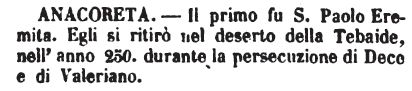 | Anacoreta - Il primo fu S. Paolo Eremita. Egli si ritirò nel deserto della Tebaide, nell'anno 250. durante la persecuzione di Deco e di Valeriano. [immagine] |