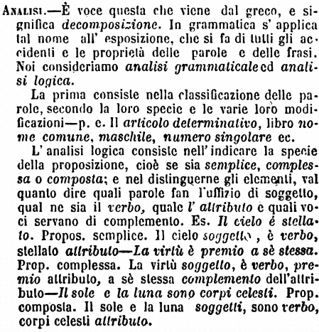 | Analisi - È voce questa che viene dal greco, e significa decomposizione. In grammatica s'applica tal nome all'esposizione, che si fa di tutti gli accidenti e le proprietà delle parole e delle frasi. Noi consideriamo analisi grammaticale ed analisi logica.