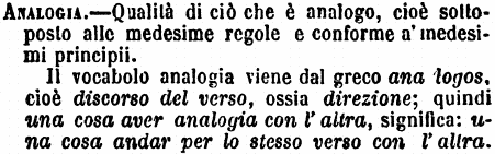 Il vocabolo analogia viene dal greco ana logos, cioè discorso del verso, ossia direzione; quindi una cosa aver analogia con l'altra, significa: una cosa andar per lo stesso verso con l'altra. [immagine] |