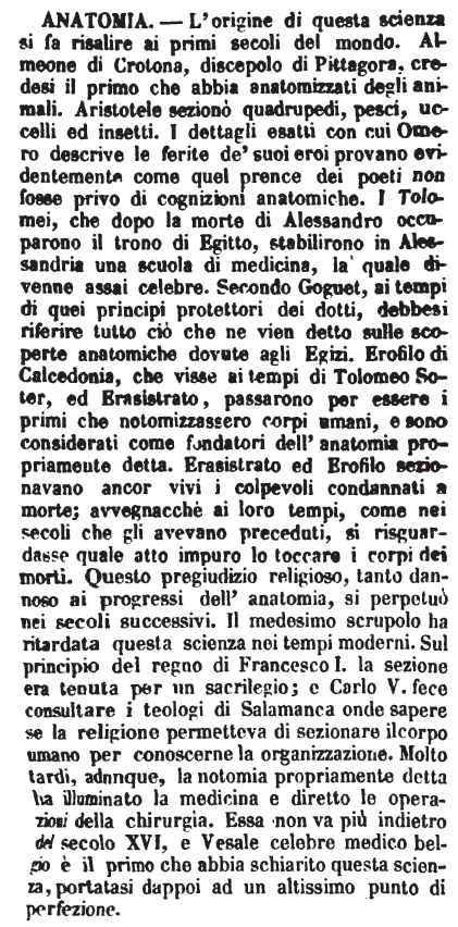 | Anatomia - L'origine di questa scienza si fa risalire ai primi secoli del mondo. Almeone di Crotona, discepolo di Pittagora, credesi il primo che abbia anatomizzati degli animali. Aristotele sezionò quadrupedi, pesci, uccelli ed insetti. I dettagli esatti con cui Omero descrive le ferite de' suoi eroi provano evidentemente come quel prence dei poeti non fosse privo di cognizioni anatomiche. I Tolomei, che dopo la morte di Alessandro occuparono il trono di Egitto, stabilirono in Alessandria una scuola di medicina, la quale divenne assai celebre. Secondo Goguet, ai tempi di quei principi protettori dei dotti, debbesi riferire tutto ciò che ne vien detto sulle scoperte anatomiche dovute agli Egizi. Erofilo di Calcedonia, che visse ai tempi di Tolomeo Soter, ed Erasistrato, passarono per essere i primi che notomizzassero corpi umani, e sono considerati come fondatori dell'anatomia propriamente detta. Erasistrato ed Erofilo sezionavano ancor vivi i colpevoli condannati a morte; avvegnacchè ai loro tempi, come nei secoli che gli avevano preceduti, si risguardasse quale atto impuro lo toccare i corpi dei morti. Questo pregiudizio religioso, tanto dannoso ai progressi dell'anatomia, si perpetuò nei secoli successivi. Il medesimo scrupolo ha ritardata questa scienza nei tempi moderni. Sul principio del regno di Francesco I. la sezione era tenuta per un sacrilegio; e Carlo V. fece consultare i teologi di Salamanca onde sapere se la religione permetteva di sezionare il corpo umano per conoscerne la organizzazione. Molto tardi, adunque, la notomia propriamente detta ha illuminato la medicina e diretto le operazioni della chirurgia. Essa non va più indietro del secolo XVI, e Vesale celebre medico belgio è il primo che abbia schiarito questa scienza, portatasi dappoi ad un altissimo punto di perfezione. [immagine] |