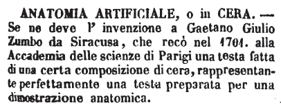 | Anatomia artificiale, o in cera - Se ne deve l'invenzione a Gaetano Giulio Zumbo da Siracusa, che recò nel 1704. alla Accademia delle scienze di Parigi una testa fatta di una certa composizione di cera, rappresentante perfettamente una testa preparata per una dimostrazione anatomica. [immagine] |