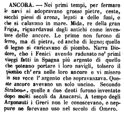 | Ancora - Nei primi tempi, per fermare le navi si adopravano grosse pietre, ceste, sacchi pieni di arena, legati a delle funi, e che si calavano in mare. Mida, re della gran Frigia, riguardavasi dagli antichi come inventore delle ancore. Le prime non furono di ferro, ma di pietra, ed anche di legno; quelle di legno si caricavano di piombo. Narra Diodoro, che i Fenici avendo radunato ne' primi viaggi fatti in Spagna più argento di quello che poteano portare i loro navigli, tolsero il piombo ch'era nelle loro ancore e vi misero in sua vece l'argento che sopravanzava. Queste ancore avevano un solo uncino. Secondo Strabone, quelle a due denti furono inventate dopo molti secoli da Anacarsi. A tempo degli Argonauti i Greci non le conoscevano, e neppure ne facevano uso nel secolo di Omero. [immagine] |