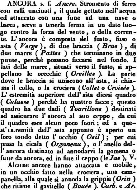 | Ancora - s. f. Ancre. Stromento di ferro con raffi uncinati, il quale gettato nell'acqua ed attaccato con una fune ad una nave o barca, serve a tenerla ferma in un dato luogo contro la forza del vento, o della corrente. L'ancora è composta del fusto, fuso o asta (Verge), di due braccia (Bras), di due marre (Pattes) che terminano in due punte, perchè possano ficcarsi nel fondo. I lati delle marre, situati verso il fusto, si appellano le orecchie (Oreilles). La parte dove le braccia si uniscono all'asta, si chiama il collo, o la crociera (Collet o Croisée). L'estremità superiore dell'asta dicesi quadro (Culasse) perchè ha quattro facce; questo quadro ha due dadi (Tourillons) destinati ad assicurare l'ancora al suo ceppo, da cui il quadro esce alcun poco fuori; ed a quest'estremità dell'asta appunto è aperto un fondo tondo detto l'occhio (Oeil); per cui passa la cicala (Organeau), o l'anello dell'ancora destinato ad annodarvi la gomena o fune da ancora, ed in fine il ceppo (le Jas), V.