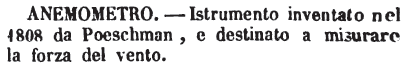 | Anemometro - Istrumento inventato nel 1808 da Poeschman, e destinato a misurare la forza del vento. [immagine] |