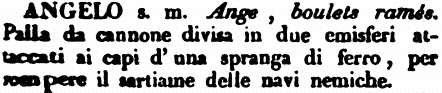 | Angelo - s. m. Ange, boulets ramés. Palla da cannone divisa in due emisferi attaccati ai capi d'una spranga di ferro, per rompere il sartiame delle navi nemiche. [immagine] |