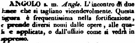 | Angolo - s. m. Angle. L'incontro di due linee che si tagliano vicendevolmente. Questa figura è frequentissima nella fortificazione, e prende diversi nomi dalle opere, alle quali è applicata, o dall'uffizio come si vedrà in appresso. [immagine] |