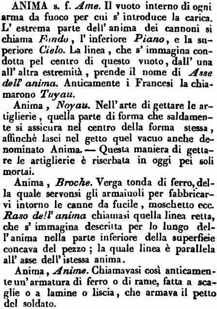 Anima - s. f. Ame. Il vuoto interno di ogni arma da fuoco per cui s'introduce la carica. L'estrema parte dell'anima dei cannoni si chiama Fondo, l'inferiore Piano, e la superiore Cielo. La linea, che s'immagina condotta pel centro di questo vuoto, dall'una all'altra estremità, prende il nome di Asse dell'anima. Anticamente i Francesi la chiamarono Tuyau.